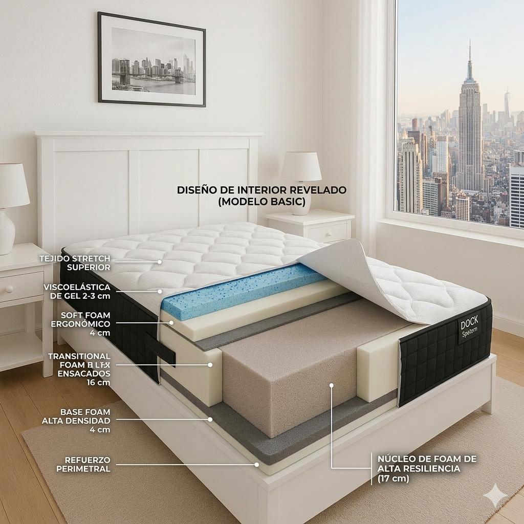 El modelo Basic es mucho más que un colchón de entrada; es un sistema de descanso completo pensado para quienes valoran la firmeza y la higiene térmica. Su estructura está optimizada para mantener la columna alineada mientras te envuelve en una sensación de confort inmediato.