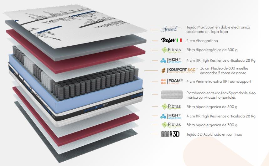 Este colchón de muelles combina diseño moderno y tecnología avanzada para ofrecer un descanso ergonómico y duradero. Su estructura interna está compuesta por muelles ensacados individualmente, lo que proporciona una excelente independencia de lechos y ventilación constante. La superficie superior está revestida con una funda acolchada transpirable de tejido elástico, con detalles gráficos contemporáneos que realzan su estética deportiva. Además, cuenta con capas de viscoelástica de alta densidad y materiales viscoelásticos que se adaptan al cuerpo, reduciendo los puntos de presión. Ideal para quienes buscan firmeza media-alta, soporte lumbar y una sensación de frescura durante el descanso.