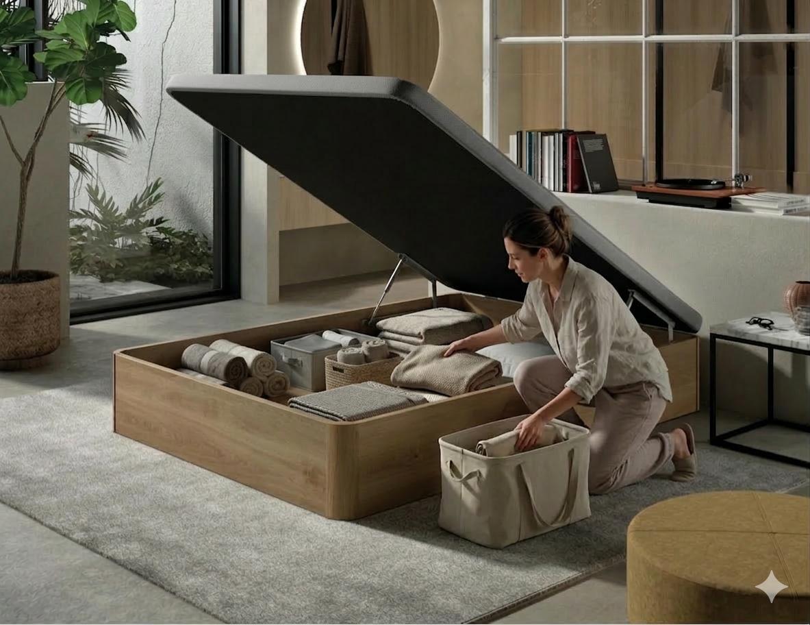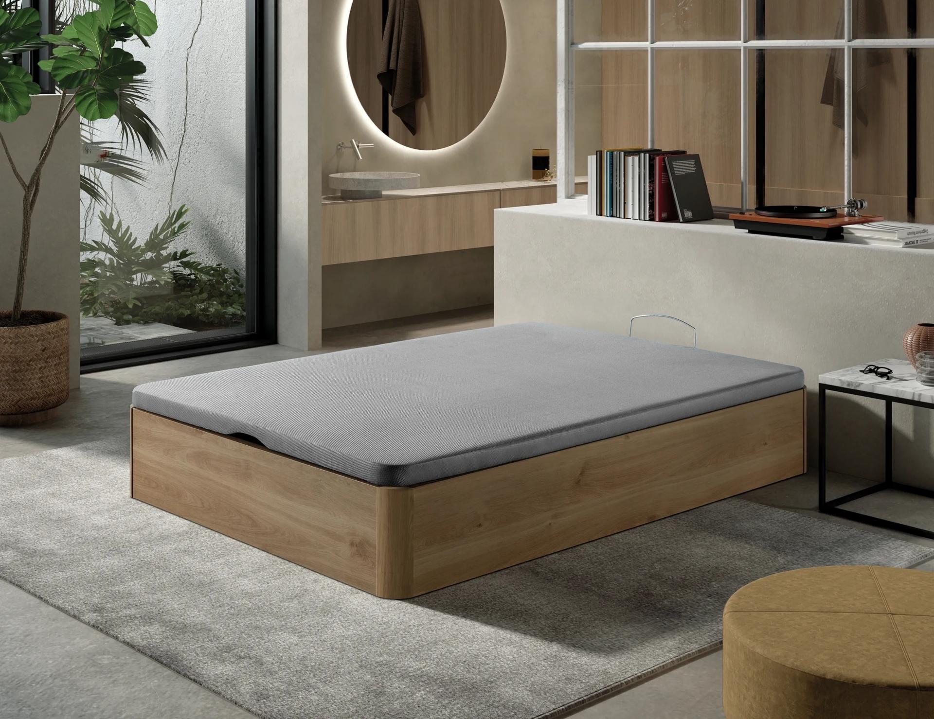 Canapé abatible de alta capacidad fabricado con arcón de madera de 30 mm de grosor, ideal para quienes buscan una solución robusta y funcional para el almacenamiento en el dormitorio. El modelo Record ofrece una estructura más sólida y detalles mejorados respecto a opciones estándar.