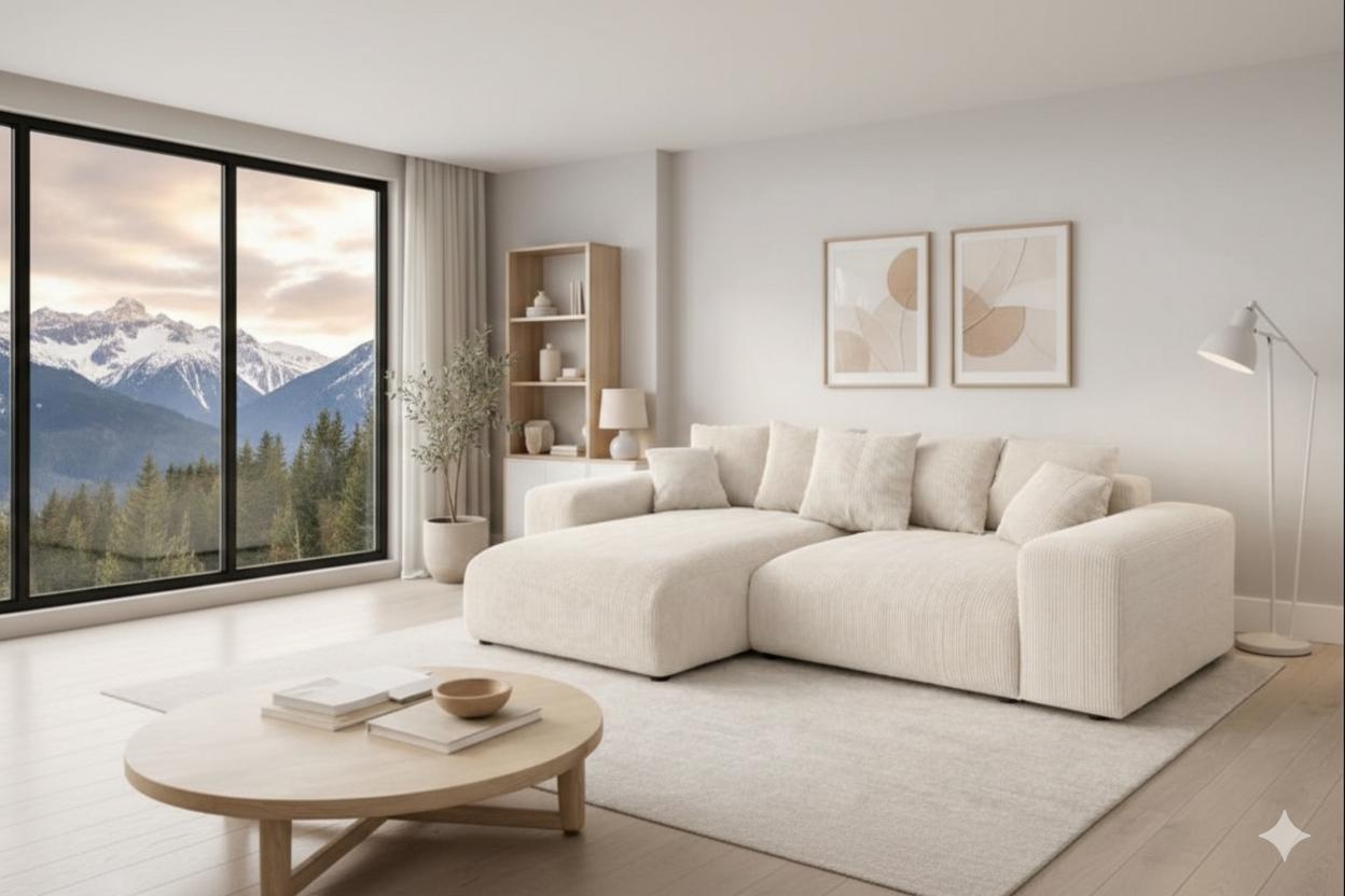 El modelo Gammel destaca por sus formas generosas y su chaise longue extra ancha, diseñada para ofrecer una experiencia de descanso total. Su tono neutro se integra perfectamente en decoraciones minimalistas, permitiendo que la luz fluya y aporte amplitud a tu hogar.